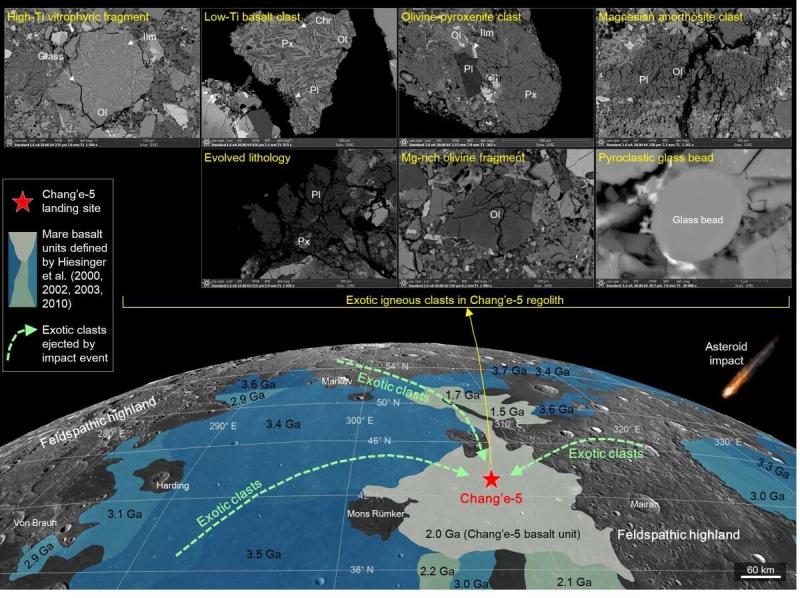 Исследователи связали найденные экзотические магматические породы с материалами, выброшенными при ударе из других регионов Луны, расположенных на расстоянии более 50-400 км от «Чанъэ-5».